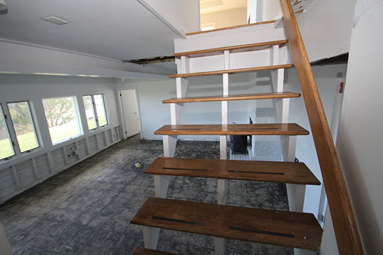 We removed a huge central chimney that was blocking almost every angle of the spectacular views and replaced it with a cozy gas fireplace. We opened as many exterior walls as we could with enormous windows and moved the stair to wrap around a two-story entry hall.