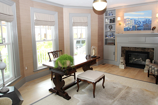 Adjoining the living room on one side is the lovely den that utilizes the original bay window and another fireplace. Grass cloth warms the walls and French doors provide quiet and privacy while allowing light to pass from the den to the living room.
