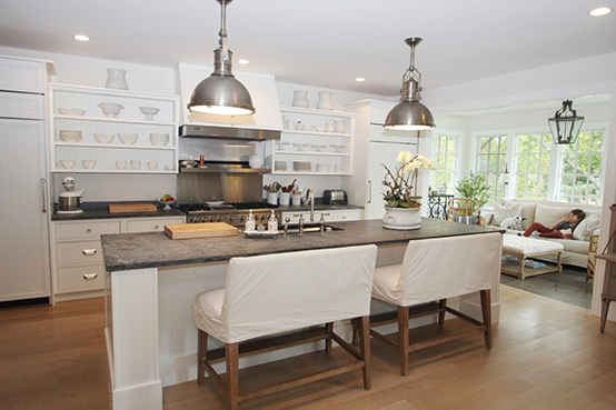 The other side of the living room is open to a contemporary kitchen. Clean, clear open shelving and counters along one wall are made possible by copious pantry and cabinet space elsewhere. The unusual upholstered benches at the counter make it a comfortable family gathering place. The soft seating contrasts with the strong industrial note of the pendant lighting.