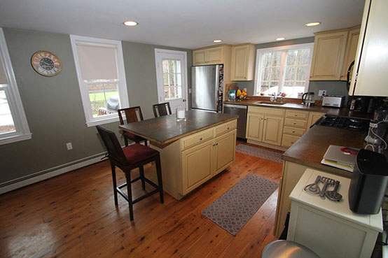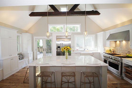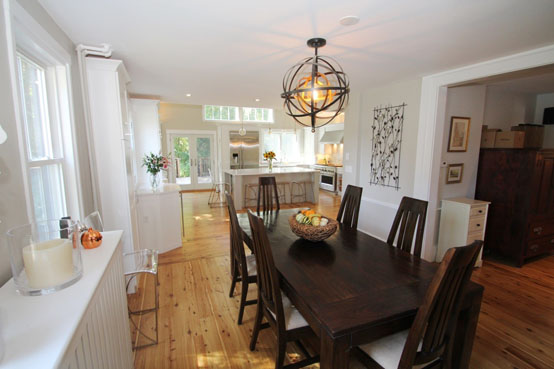 The dark and cramped old kitchen now shines with natural light and opens to the rest of the house, as well as the deck and the rest of the property.