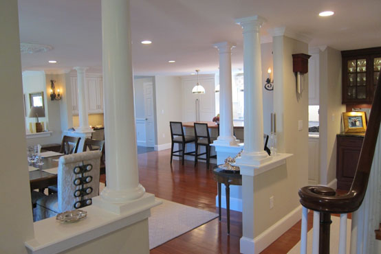The kitchen and dining spaces lead past an office nook and into a new family room.